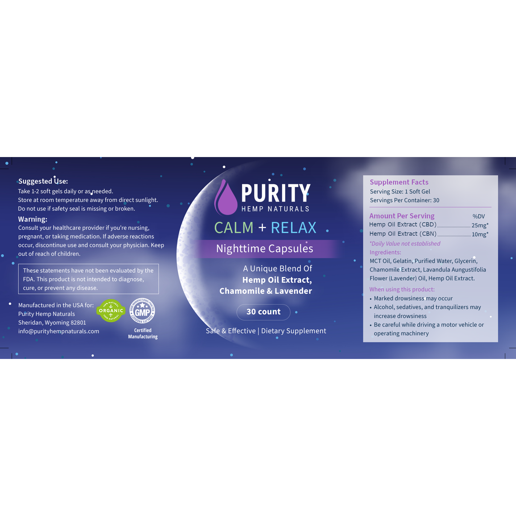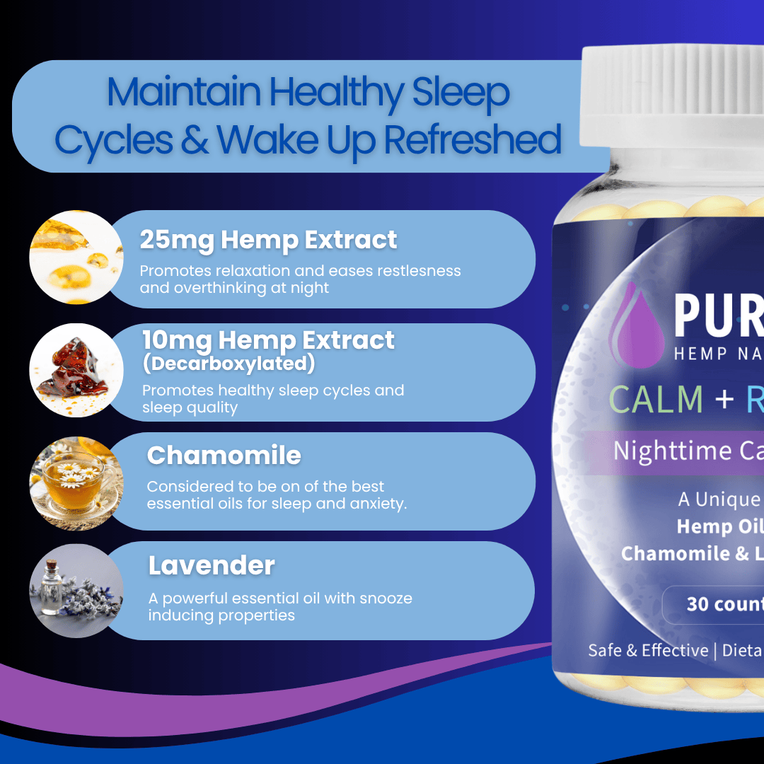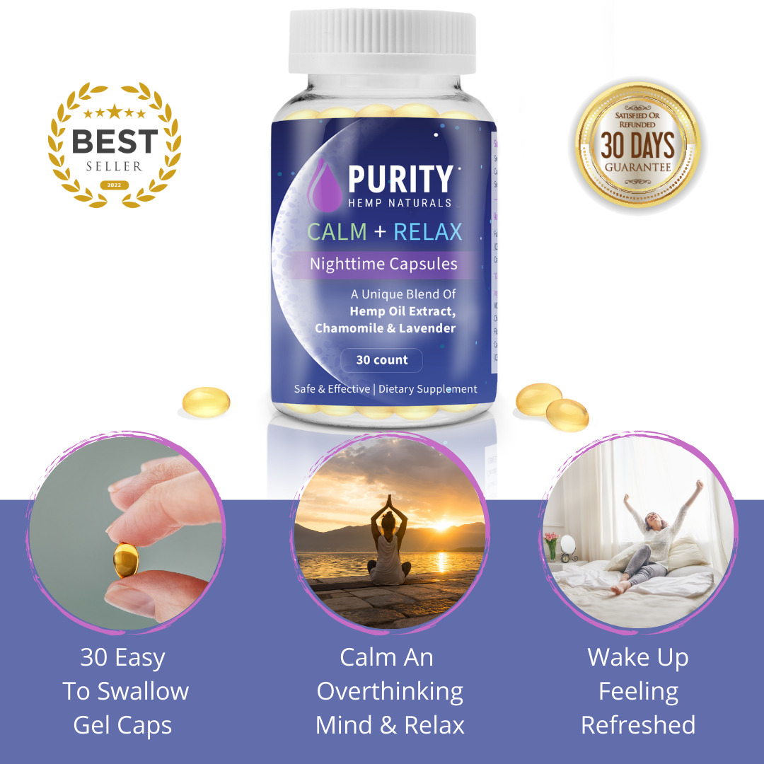 Fall asleep faster and rest an active mind with CALM + RELAX Nighttime Softgels. This unique blend of Hemp Oil Extract, Chamomile & Lavender promotes deep relaxation and peacefulness to improve your sleep quality. Use these softgels when you need to reduce overthinking or get a sounder sleep and wake up feeling refreshed. Non-habit forming, No THC and No High.